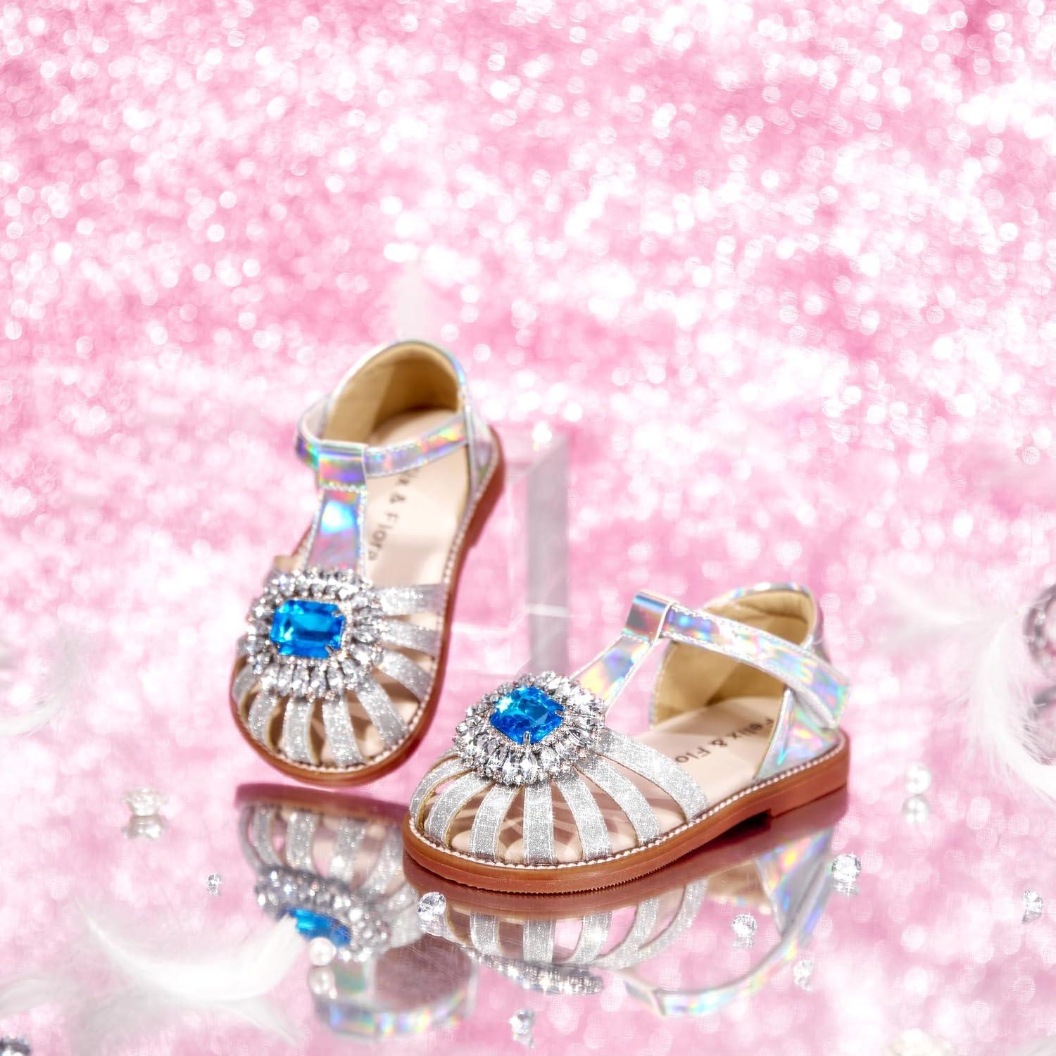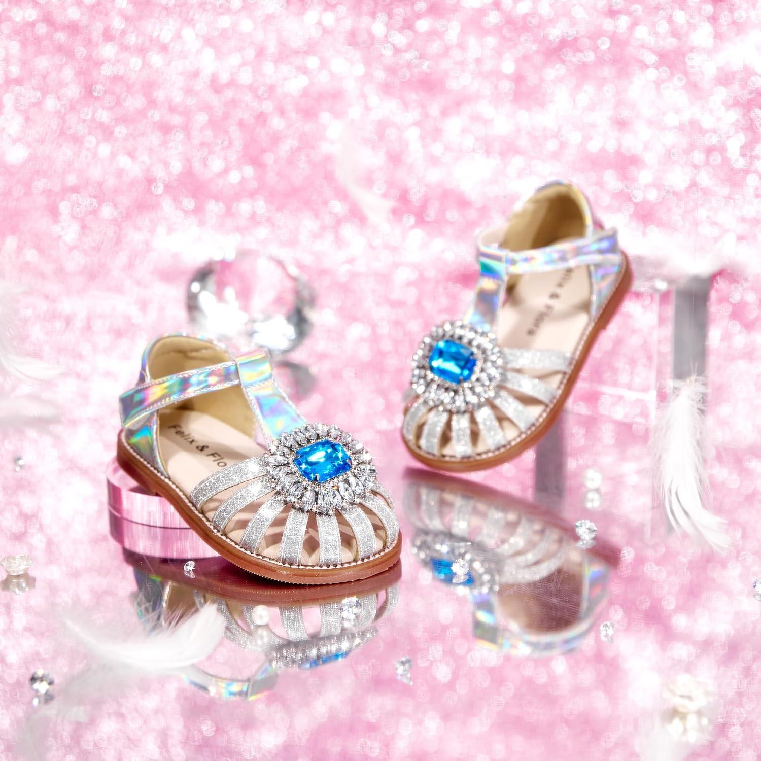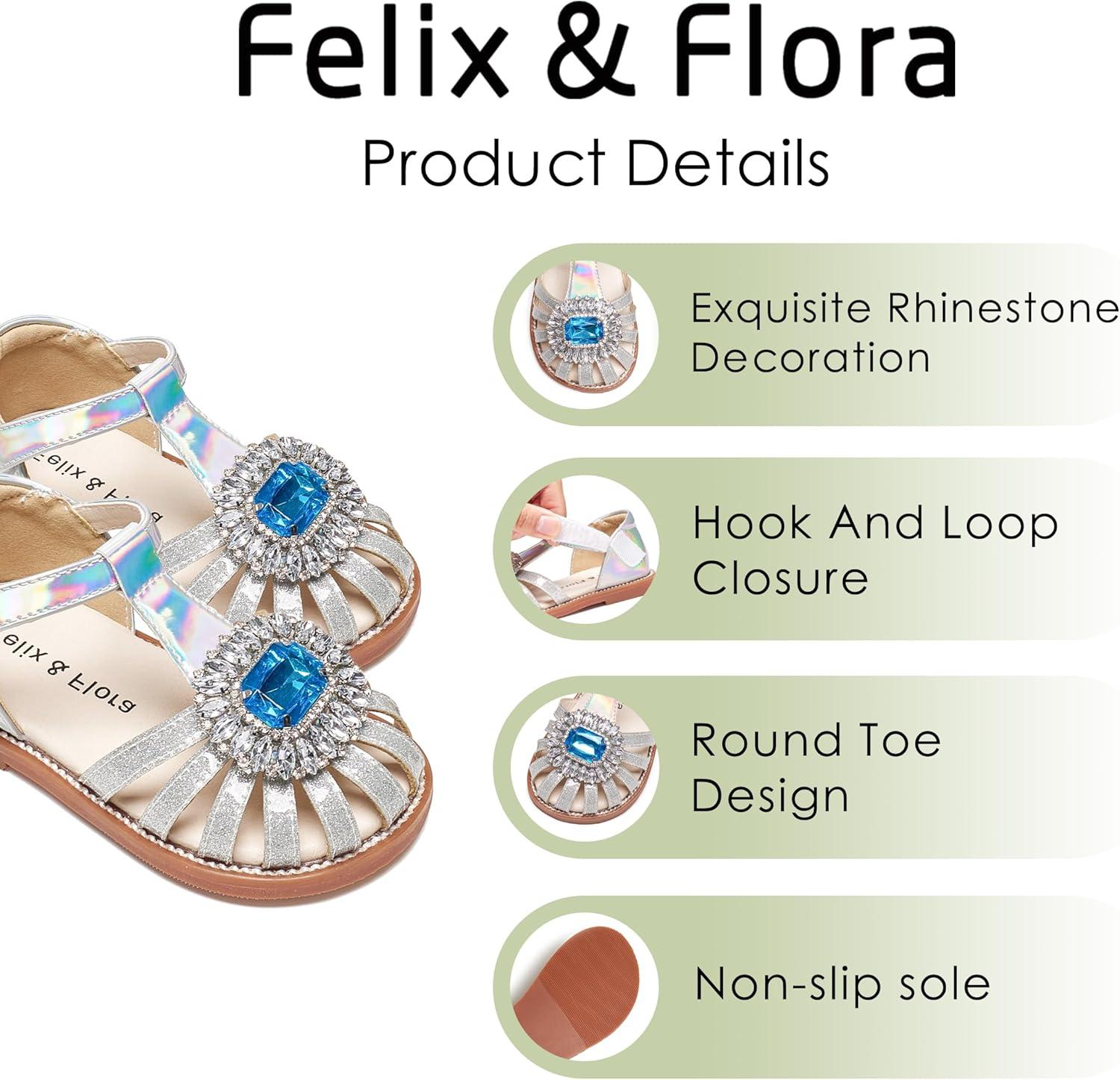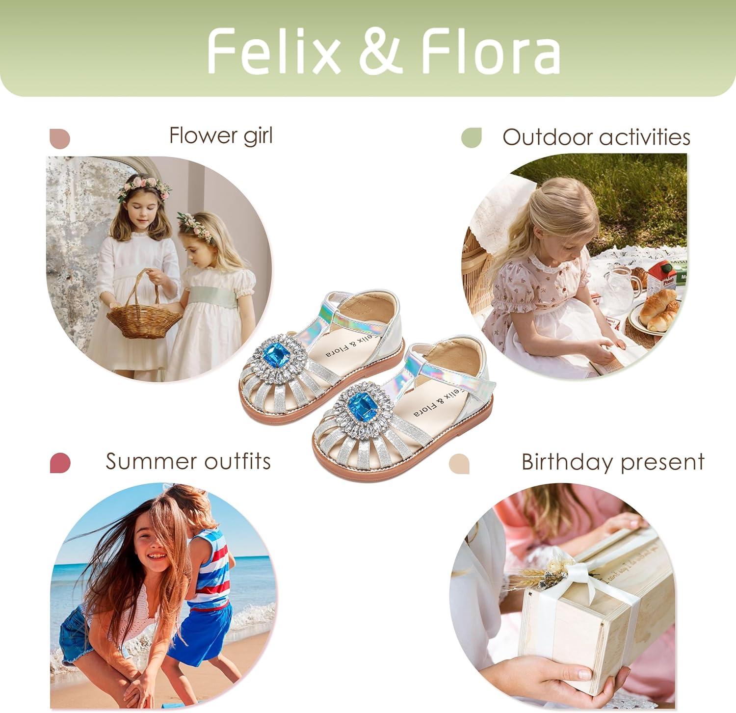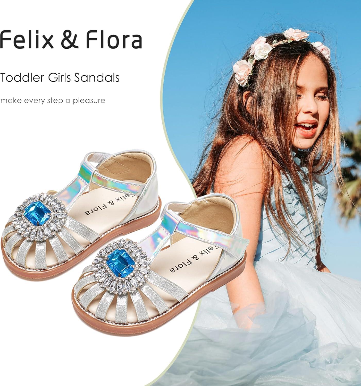 Felix & Flora Toddler Girls Sandals Soft Rubber Princess Flat Shoes Summer Flower Girl Shoes(Bc321-silver)